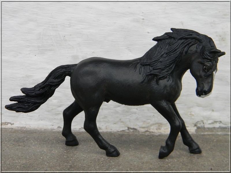 Geschlecht: Hengst Farbe: Schwarzbrauner mit Blesse Alter: 2 Jahre Custjahr: 2010 Grundmodell: Andalusier - Hengst von Schleich Art: Repaint Sonstiges: Nüstern & Augen sind glossy, mehrfarbige Hufe, reale Augen, wirkt manchmal braun, manchmal schwarz, manchmal eher grau |