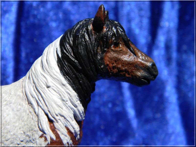 Das Grundmodell für " SWC Piroschka " war die Lippizzaner - Stute von Schleich. Piroschka hat viele Schattierungen, eine sehr ausgefranste Scheckung sowie mehrfarbigen Hufe. Wie alle anderen Pferde auch, hat sie glossie Nüstern, sowie glossie und reale augen und ist mit einem Schutzlack besprüht.