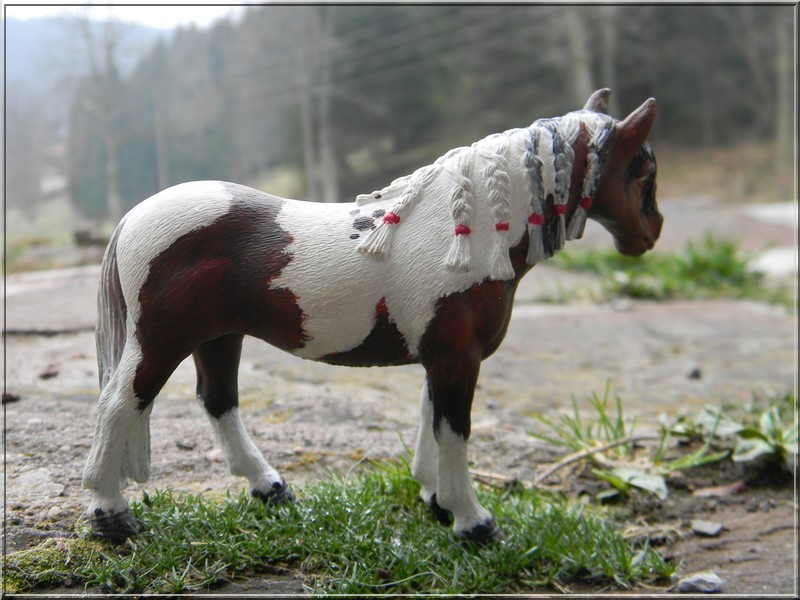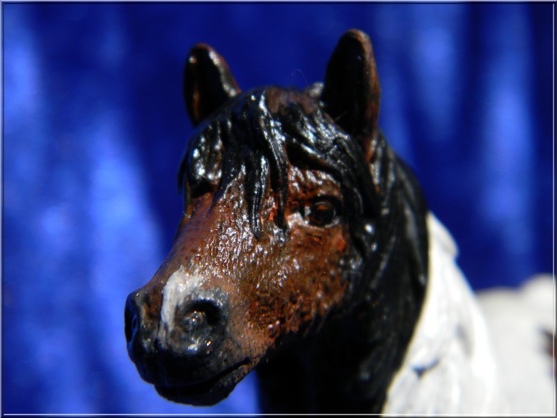 Das Grundmodell für " SWC Curly " war die Andalusier - Stute von Schleich. Ich habe das Modell zu einer hübschen Mittelbraunscheckin mit vielen Schattierungen und reale eyes sowie mehrfarbigen Hufen bemalt. Wie alle anderen Pferde auch, hat sie glossie Nüstern, sowie glossie und reale augen und ist mit einem Schutzlack besprüht.