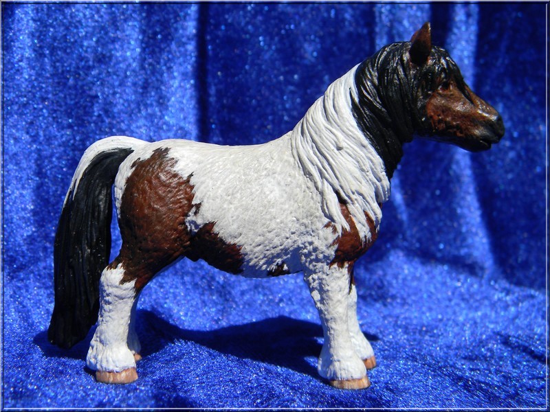 Das Grundmodell für " SWC Jimmy " war der aktuelle Schettlandpony - Hengst von Schleich. Ich habe das Modell zu einem hübschen Braunschecken mit vielen Schattierungen und reale eyes sowie mehrfarbigen Hufen bemalt. Wie alle anderen Pferde auch, hat er glossie Nüstern, sowie glossie und reale Augen und ist mit einem Schutzlack besprüht. Jimmy hat außerdem noch ein helles Maul. Zudem haben seine ohren einen schwarzen "rand".